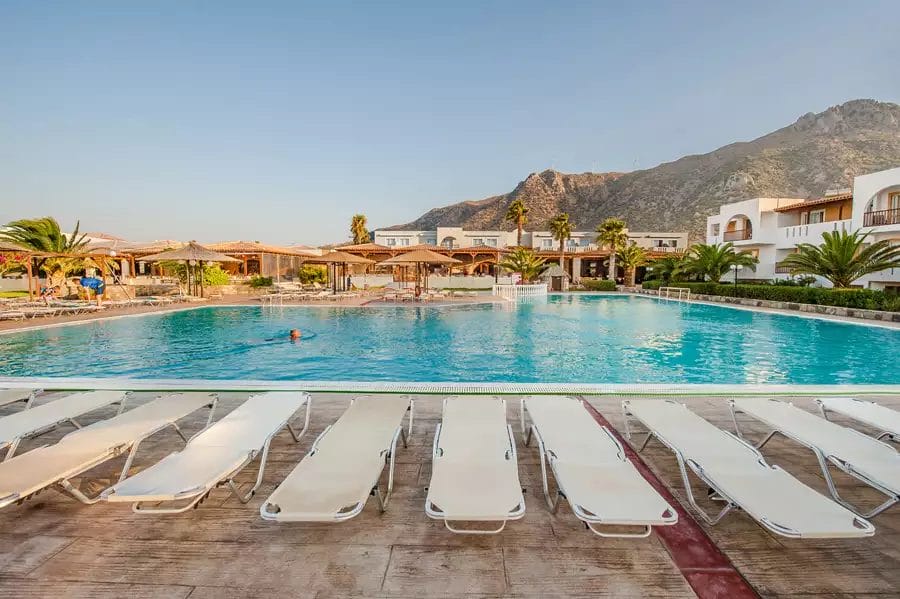 A circa 4 km da Kardamena, 27 km da Kos città e 10 km dall’aeroporto. L’hotel mette a disposizione degli ospiti un servizio gratuito di navetta a orari fissi da e per Kardamena. Fermata bus di linea a 100 m. Il complesso si estende su una vasta area con ampie zone verdi ed è costituito da un corpo centrale e numerosi edifici in stile bungalow a 2 piani raggruppati in diversi blocchi intorno alle piscine. Uno di questi blocchi ospita la sezione Kalimera riservata ai maggiori di 16 anni.
