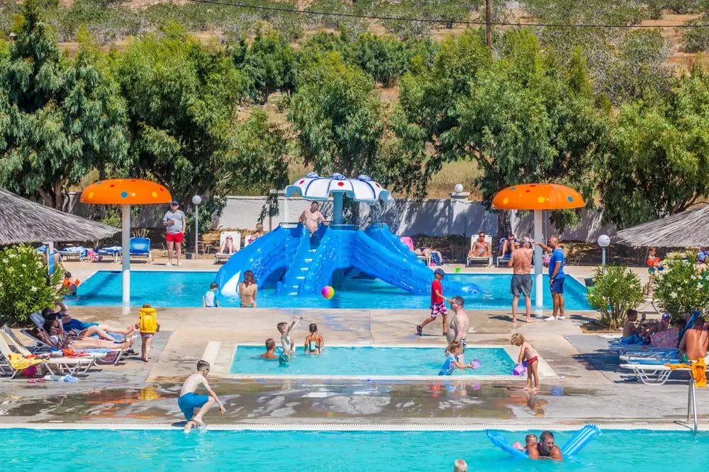 Si affaccia sulla bella spiaggia di sabbia e ciottoli raggiungibile attraversando la stradina litoranea. L’accesso al mare, in alcuni tratti di soli ciottoli, è facilitato dalla presenza di passerelle sul fondale. Un’area della spiaggia è riservata ai soli adulti over 16 anni. Dispone di 9 piscine, 5 per adulti di cui 3 nella sezione Kalimera, e 4 per bambini di cui una con scivoli, oltre alle 15 in uso esclusivo ad alcuni tipi di camera, tutte sono di acqua dolce contenente sale. Uso gratuito di lettini e ombrelloni sia in piscina sia in spiaggia (fino a esaurimento), disponibili teli mare.