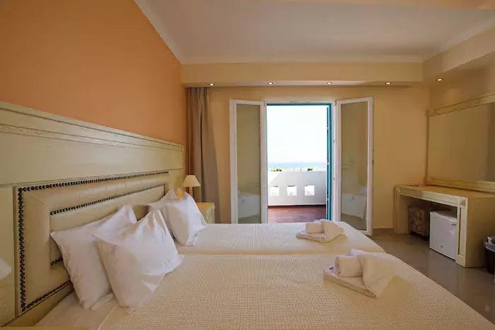 Il Bravo Naxos Imperial è composto da 114 camere dislocate tra un corpo centrale e blocchi separati situati all’interno della struttura o a pochi passi dalla stessa, e suddivise in molteplici tipologie. Le camere standard vista giardino o vista mare laterale, tutte molto ampie e confortevoli, si trovano al piano terra e vi si accede scendendo alcuni scalini dai vialetti che collegano gli edifici del corpo centrale. Le superior vista giardino o vista mare laterale o vista mare hanno le stesse caratteristiche delle standard ma sono situate al primo o al secondo piano; le smart sono collocate in un blocco appena fuori dal complesso a pochi passi dalla reception; le camere caletta si trovano in un edificio nei pressi della caletta privata. Sono inoltre presenti altri blocchi di camere separati dal corpo centrale, ma situati in posizione adiacente al villaggio, dove sono ubicate ulteriori standard vista giardino o vista mare, una maisonette composta da una camera matrimoniale, due camere singole, un bagno e un soggiorno (min/max 4 persone) e delle camere familiari più ampie, che possono ospitare min/max 4 persone, situate al piano terra, anch’esse con un piccolo soggiorno. Tutte le tipologie sono dotate di balcone o terrazza, servizi privati (con doccia o vasca), aria condizionata, TV satellitare, minifrigo rifornito con acqua all’arrivo, telefono, connessione internet via cavo su cauzione, accesso internet Wi-Fi, cassetta di sicurezza.