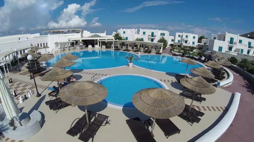 Il villaggio si trova a soli 350 metri dalla famosa e lunga spiaggia di sabbia dorata a grana grossa di Agios Prokopios, attrezzata con lettini e ombrelloni, e si affaccia inoltre su una caletta privata dove il mare limpido e cristallino è una vera meraviglia. Nel complesso sono presenti tre piscine d’acqua dolce: una più ampia dedicata al relax e una per bambini situate in zona centrale, mentre la terza più animata si trova nei pressi della caletta. L’utilizzo di lettini e ombrelloni è gratuito presso le piscine, nella caletta privata e in spiaggia (fino a esaurimento); teli mare su cauzione.