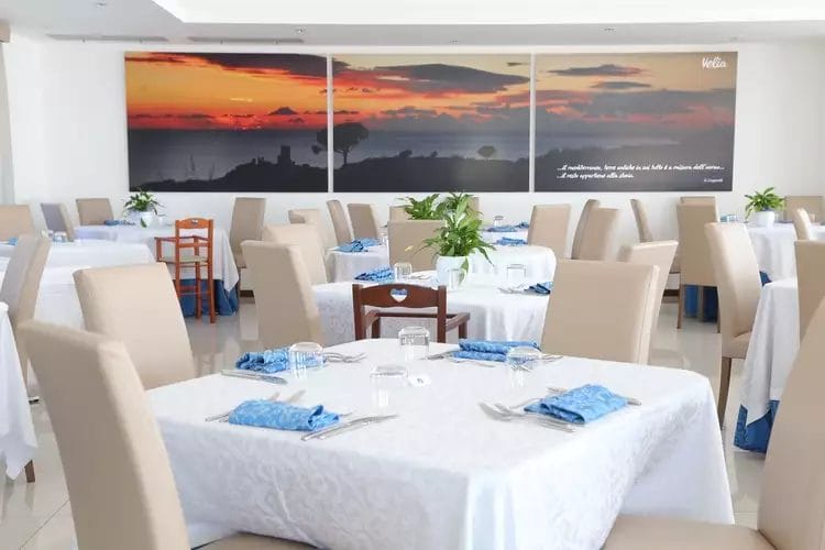 Prima colazione a buffet con angolo benessere, angolo Cilentano con prodotti locali a km 0 e angolo vegano. Pasti a buffet con vasta scelta di piatti della cucina tipica regionale e nazionale; acqua in caraffa e vino locale inclusi ai pasti. Settimanalmente serata a tema. Possibilità di cucina per celiaci (forniti alimenti base, non garantita assenza di contaminazione).